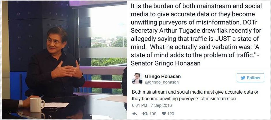 "It is the burden of both mainstream and social media to give accurate data or they become unwitting purveyors of misinformation. DOTr Secretary Arthur Tugade drew flak recently for allegedly saying that traffic is JUST a state of mind. What he actually said verbatim was: "A state of mind adds to the problem of traffic." - Senator Gringo Honasan"
